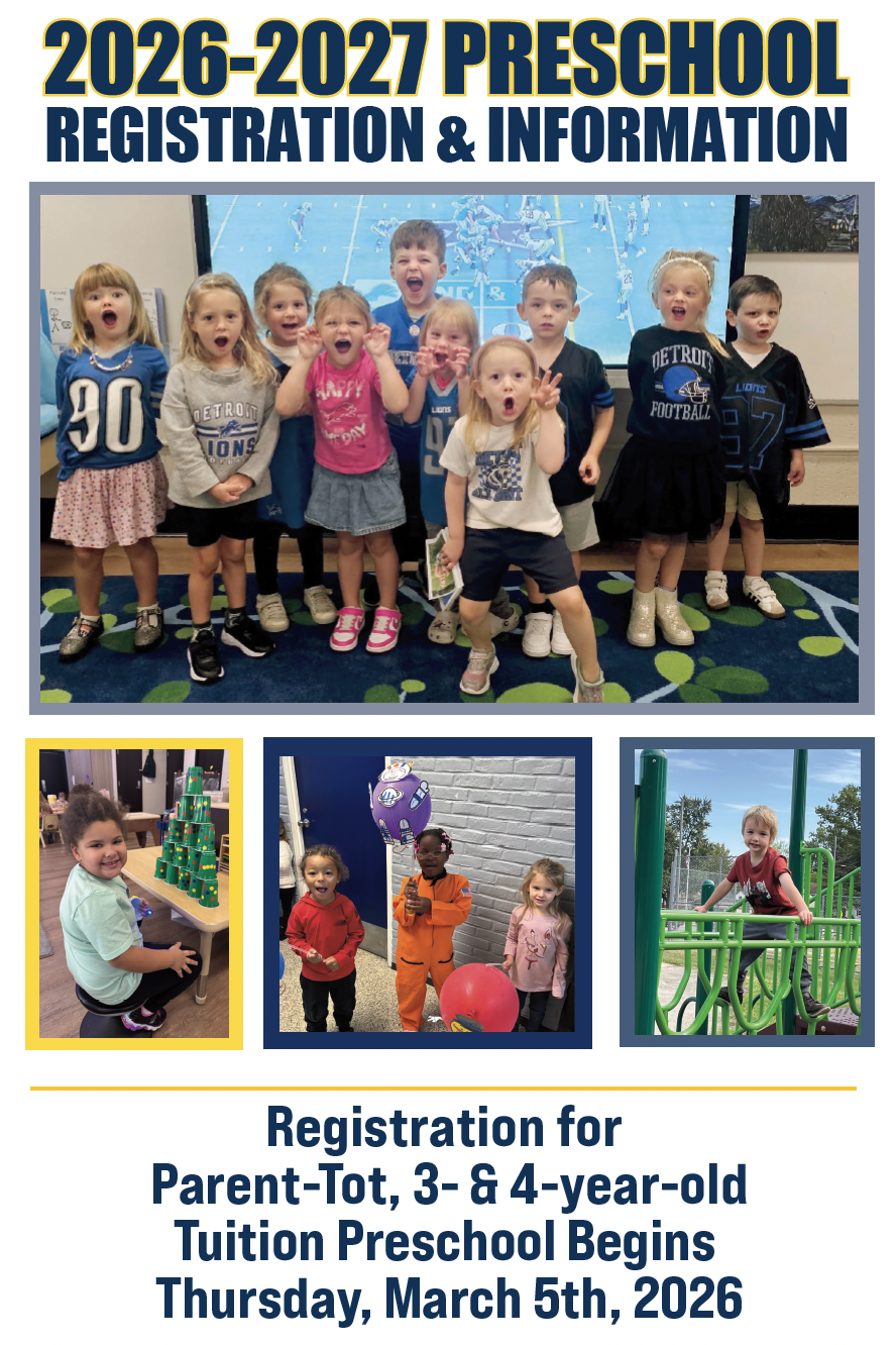 If you’d like to register for Preschool for the 2026-27 school year, please contact Claire Prost at 248-655-3836 or Heather Kotz at 248-655-3834 for availability.