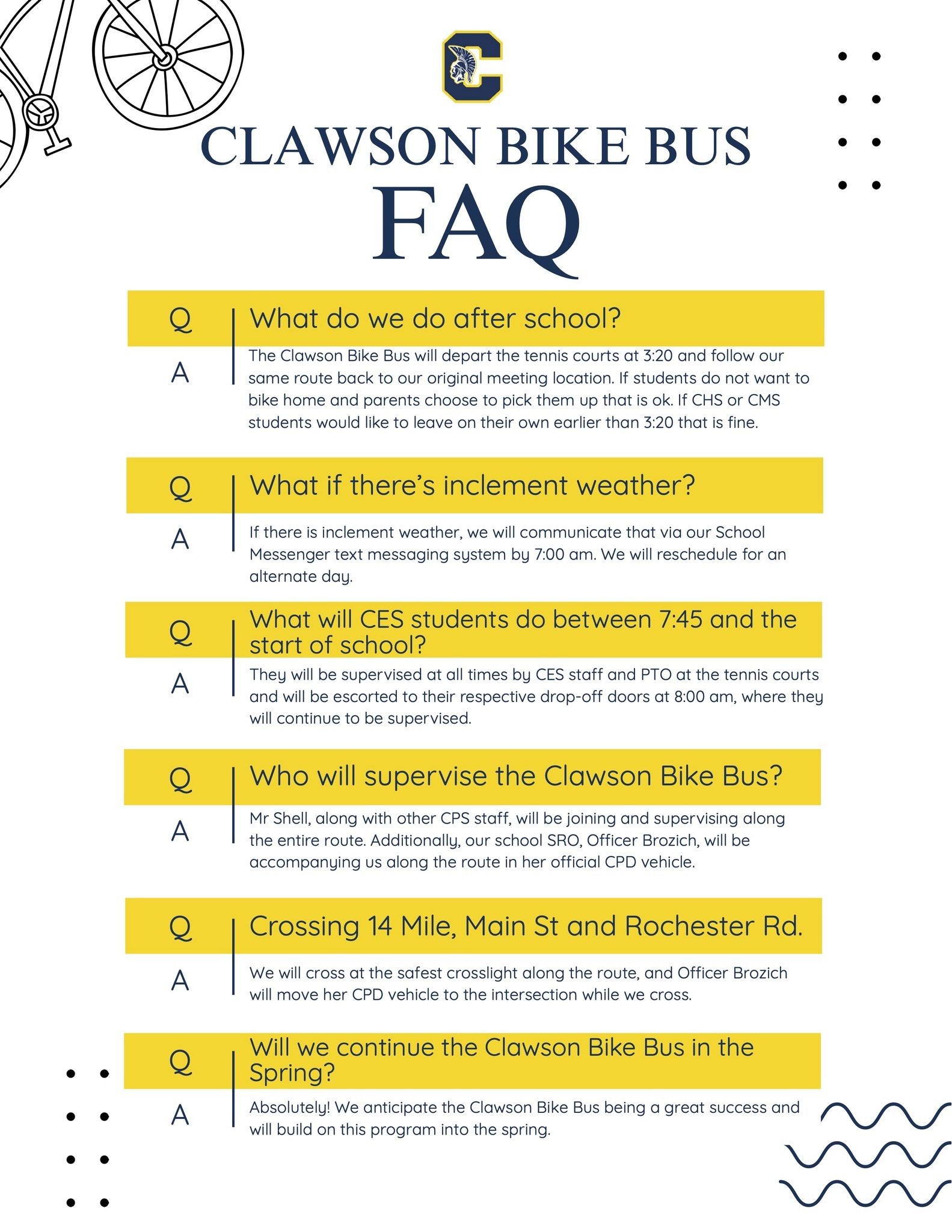We know there will be many questions around the logistics of this initiative, so please see the attached Clawson Bike Bus FAQ to answer any questions you may have.